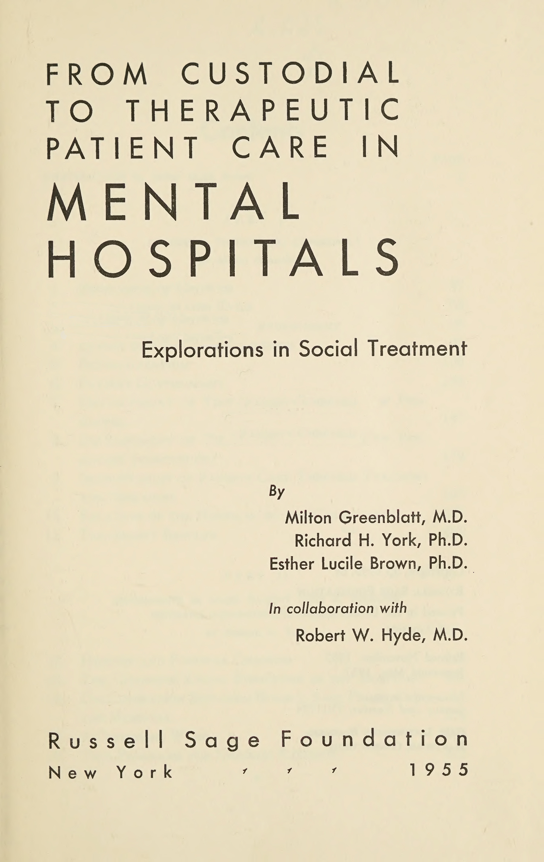 An examination of the rise and development of therapeutic care for mental illness, studying the activities involved in providing ward care to hospitalized mental health patients. This book came about as a result of a nationwide survey of patient care as provided in representative state and psychiatric hospitals, as well as an experimental project with the Boston Psychopathic Hospital to establish cooperative relations with a state and a neuropsychiatric Veterans Administration hospital in the vicinity, in order to test the applicability of principles and practices such as those used by it. In collaboration with Robert W. Hyde.