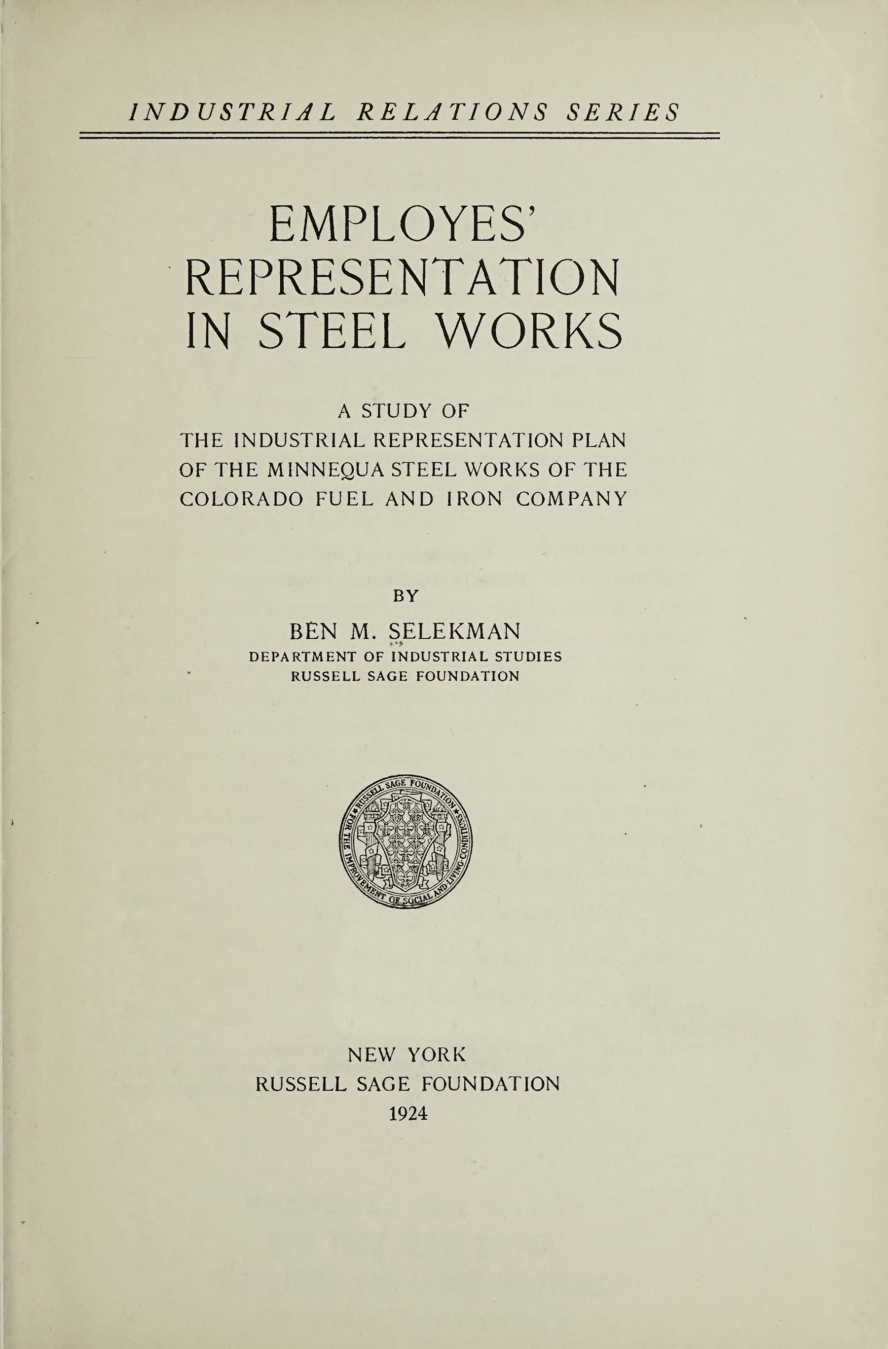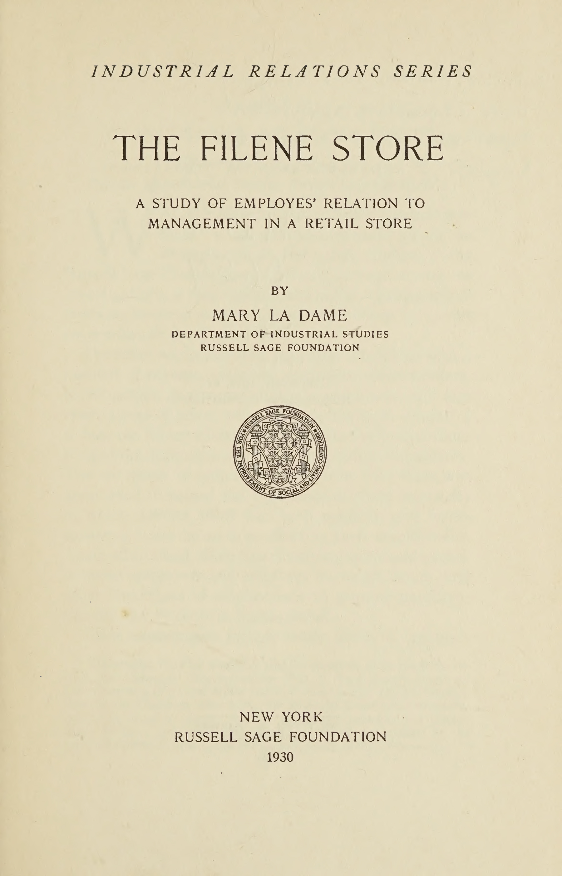 With a foreword by Mary Van Kleeck. Part of the Industrial Relations Series, a series by the Department of Industrial Studies of the Russell Sage Foundation investigating early twentieth-century experiments in the organization of relations between employers and employees in industrial enterprises in the United States. This volume examined William Filene’s Sons Company, a Boston department store, particularly the development of its human relations as an integral part of its business aims and its methods of management.