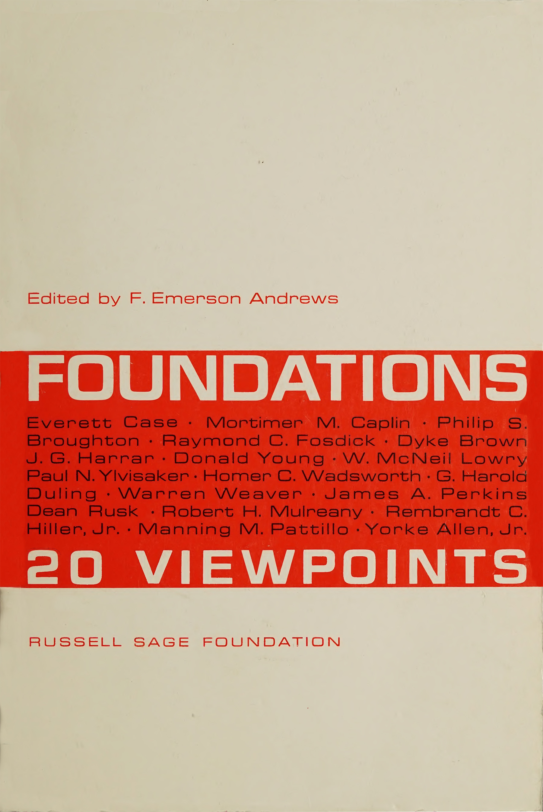 Published in 1965, Foundations: 20 Viewpoints made readily available some of the significant and timely discussions of foundations that had appeared in Foundation News, the bimonthly Bulletin issued by the Foundation Library Center. The articles fall into three general categories: broad discussions of private philanthropy and foundations, lists of recent fields in which foundations make grants and operations, and a section on running foundations.